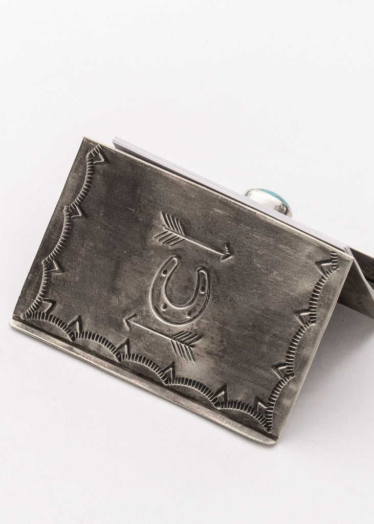 Introducing the Stamped Business Card Holder with Turquoise, a stunning addition to your desk or office space. Handcrafted with care by J. Alexander Rustic Silver artisans, this piece exudes Southwestern charm and vintage appeal.