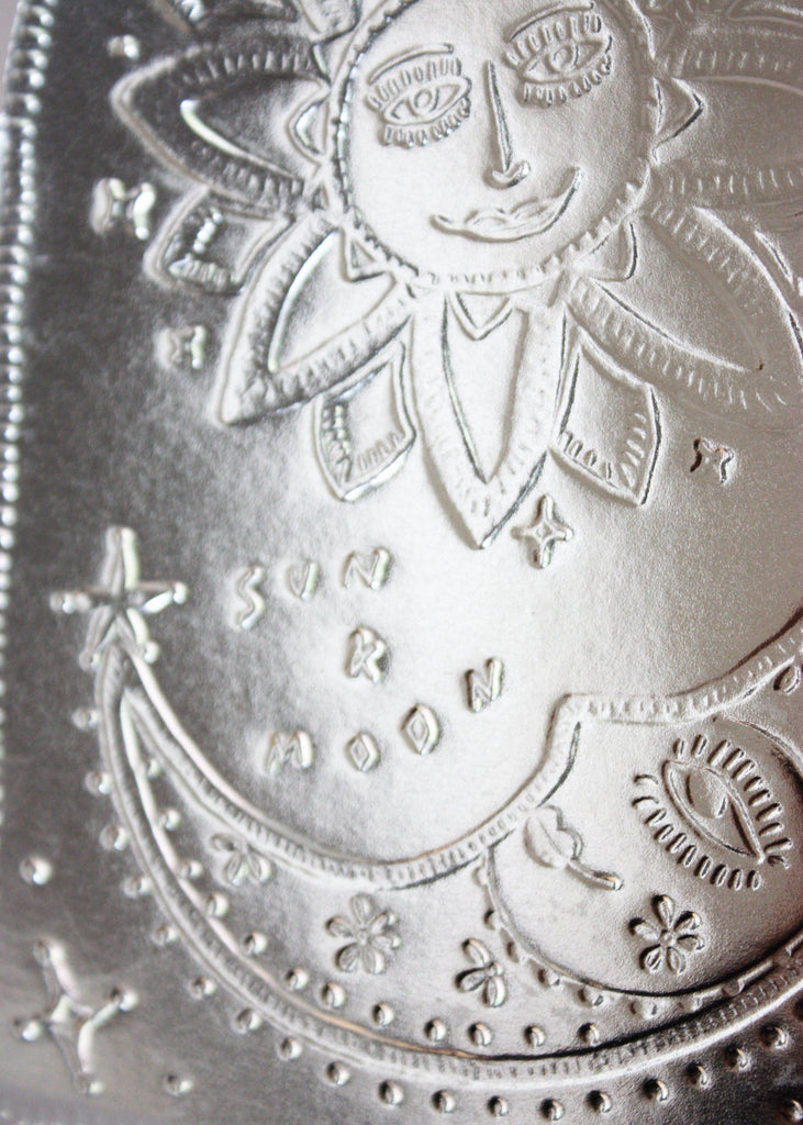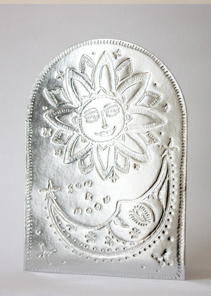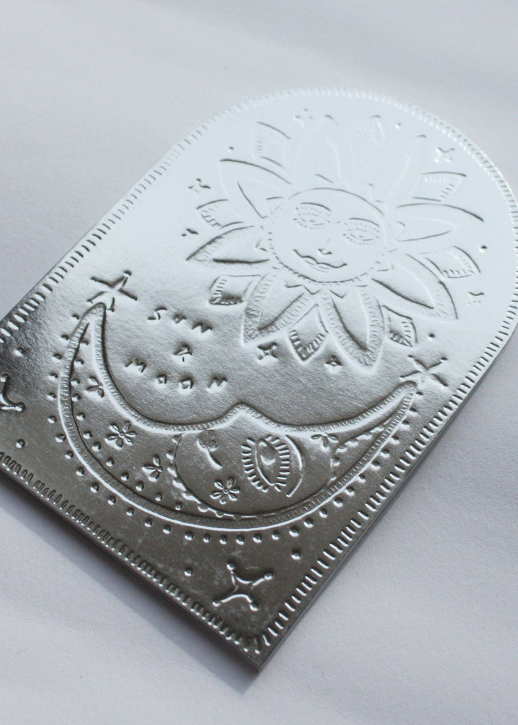 A pressed tin look and feel, but this special paper has been chosen by us as it is 100% recyclable. Design features hand drawn Sun & Moon and hand lettering Letterpress and diecut into an arch shape, folds along the left side, blank on the inside for your personal message. Paired with standard size 100% post consumer recycled envelopes.