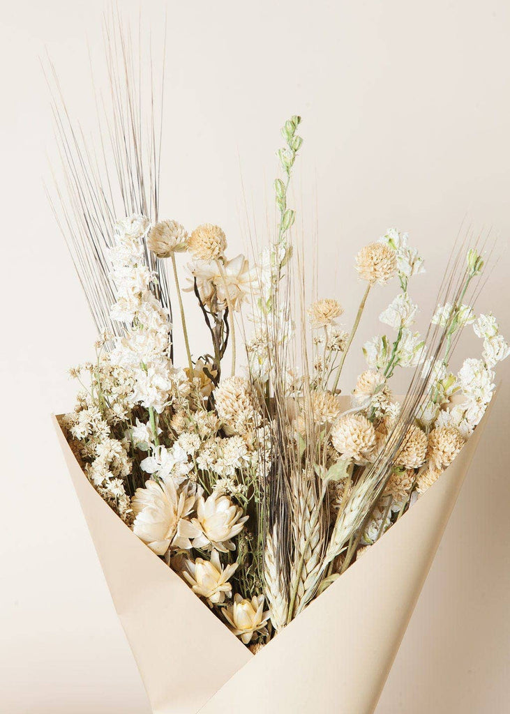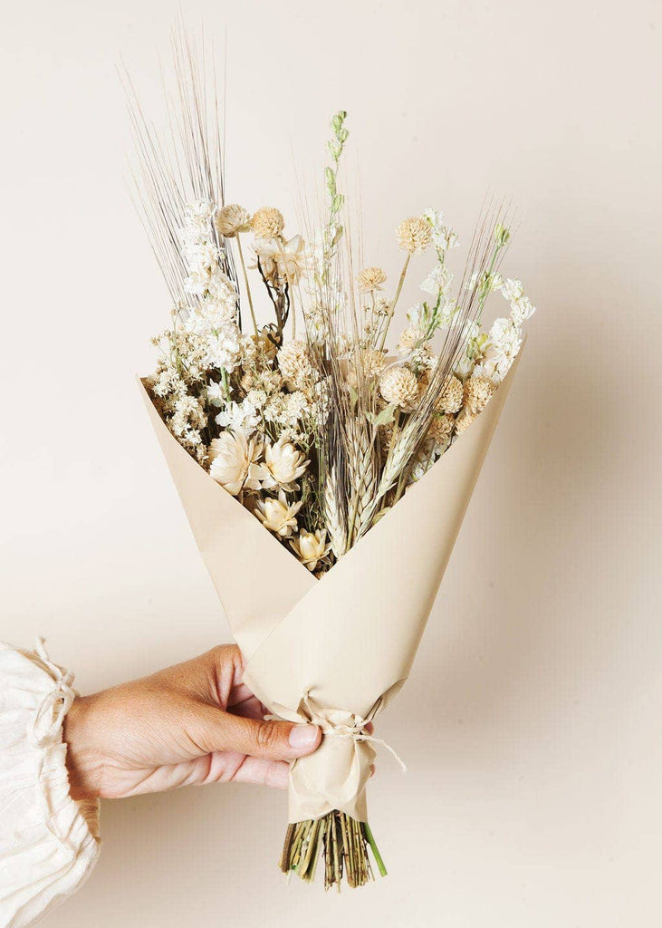 A lovely neutral mix of sage green and creamy white florals and grasses. Handcrafted and grown in the USA, each bouquet is made of naturally dried flowers for a lasting touch of nature. 12" tall x 6" wide Fills a 4"-6" tall vase with a 2" opening