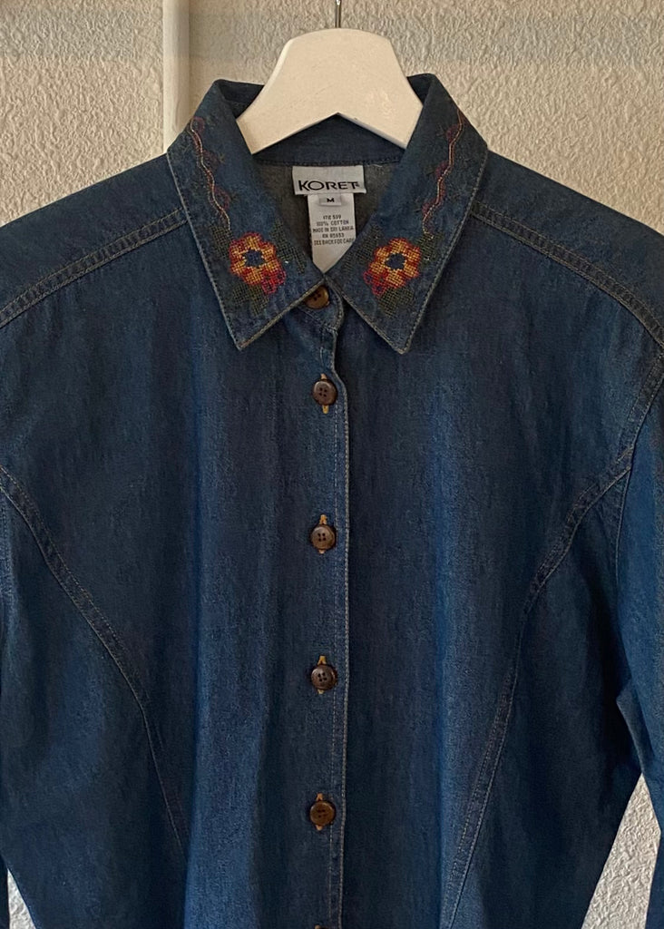 Denim button up with a floral needlepoint pattern on the collar and buttoned sleeve cuffs.