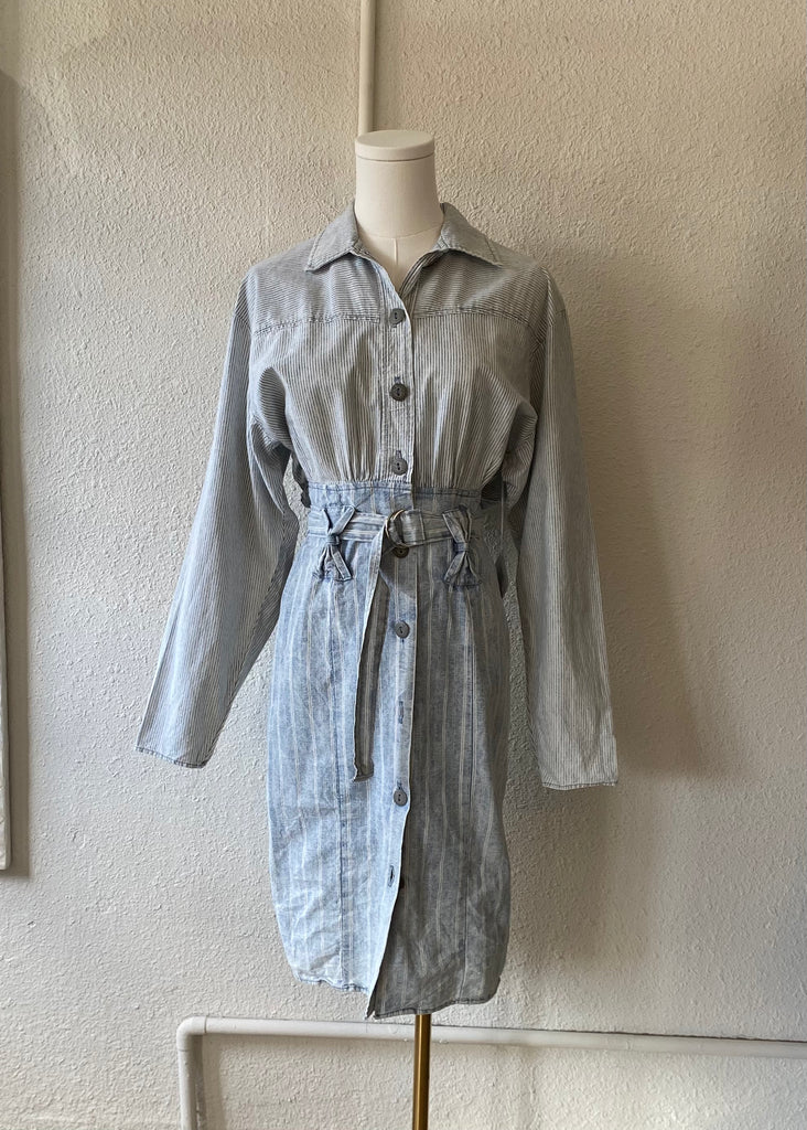 Light washed dress with contrasting striped patterns, full button up, and matching belt.