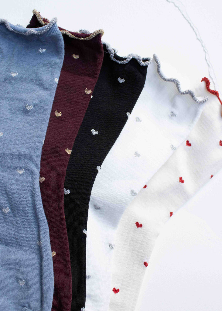 Sweet and stylish, designed with dainty heart patterns and a playful lettuce-edge trim. Made from a soft cotton blend, these socks are lightweight, stretchy, and comfortable enough for everyday wear.