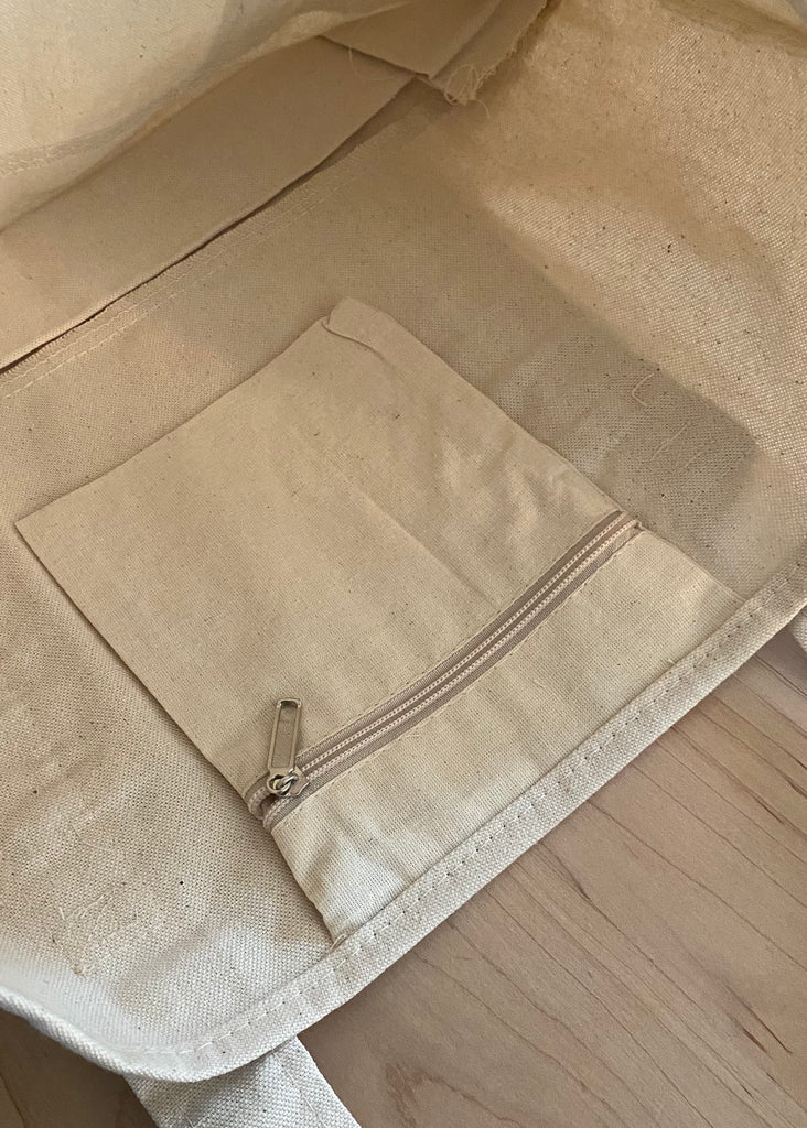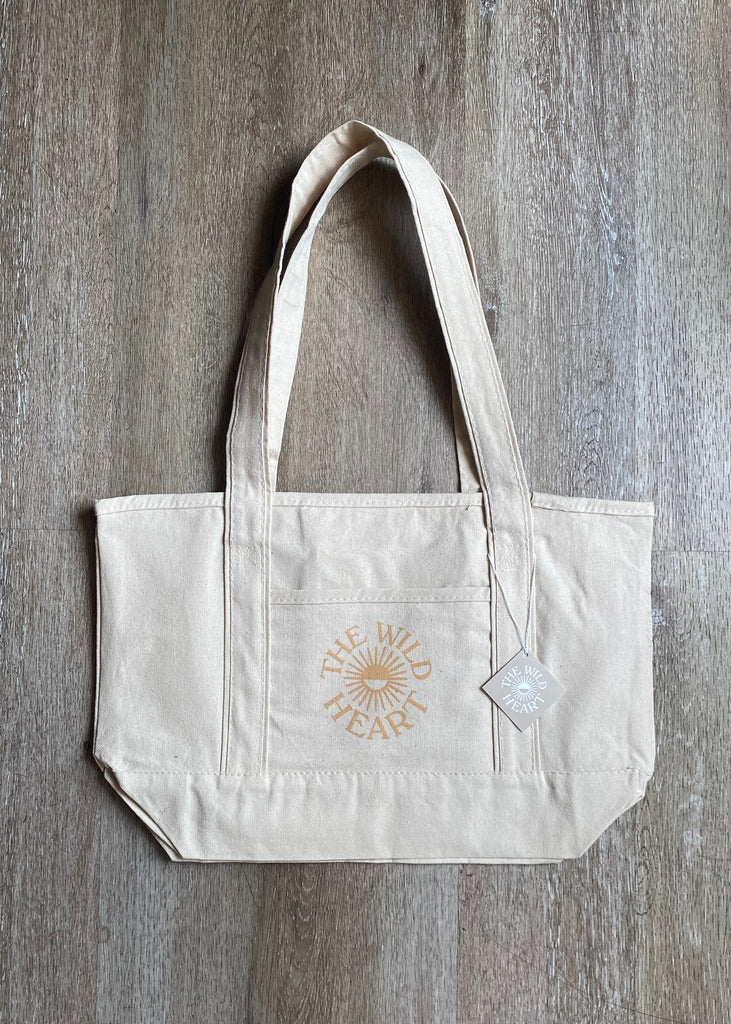 Classic canvas tote bag featuring a front pocket, sturdy handles, zipper pocket inside, and our Wild Heart Logo on the front!