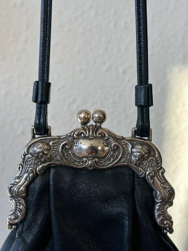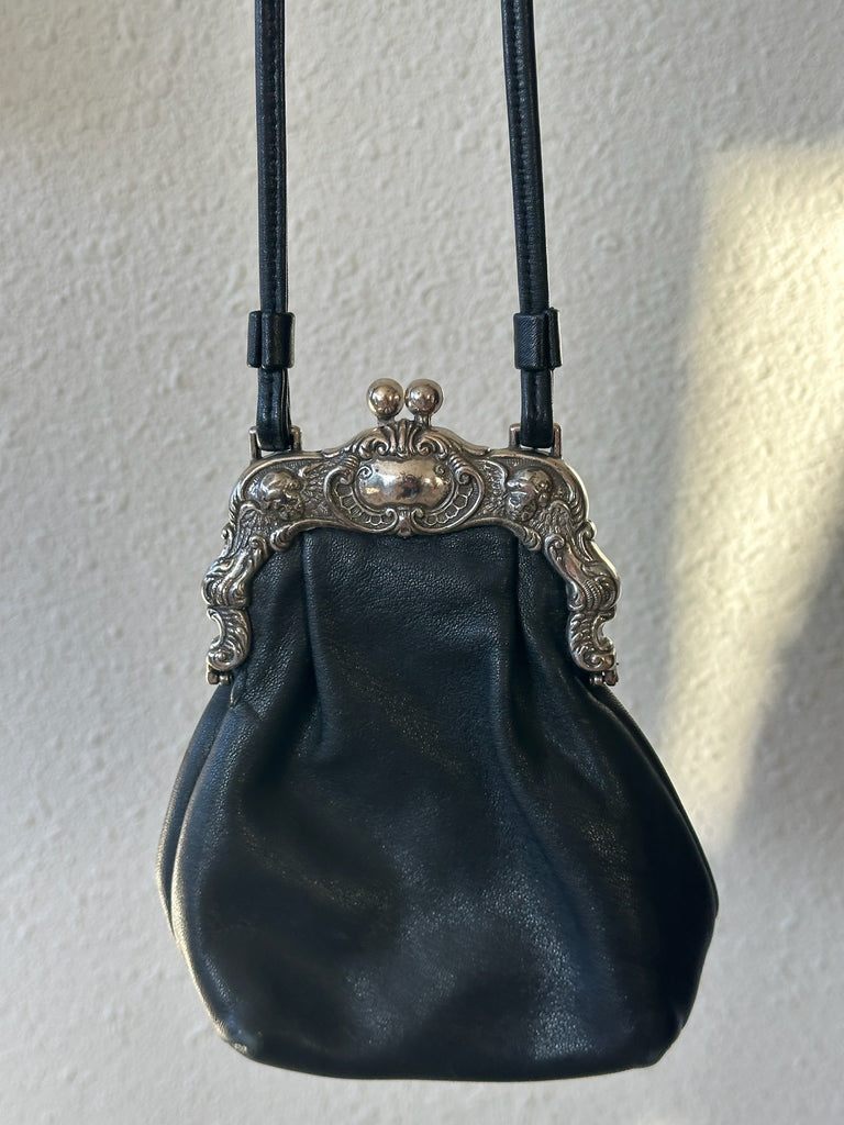 Vintage black Brighton purse featuring a compact, structured silhouette with silver-tone hardware. Black leather exterior with a long shoulder strap and a clip/clasp closure. Lined interior with a slip pocket for small essentials.