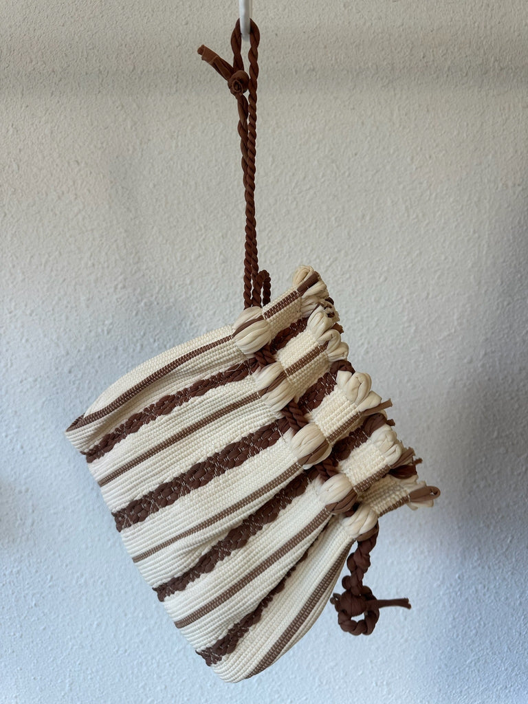 Vintage drawstring purse with soft structure, drawstring closure, and shoulder-length strap.