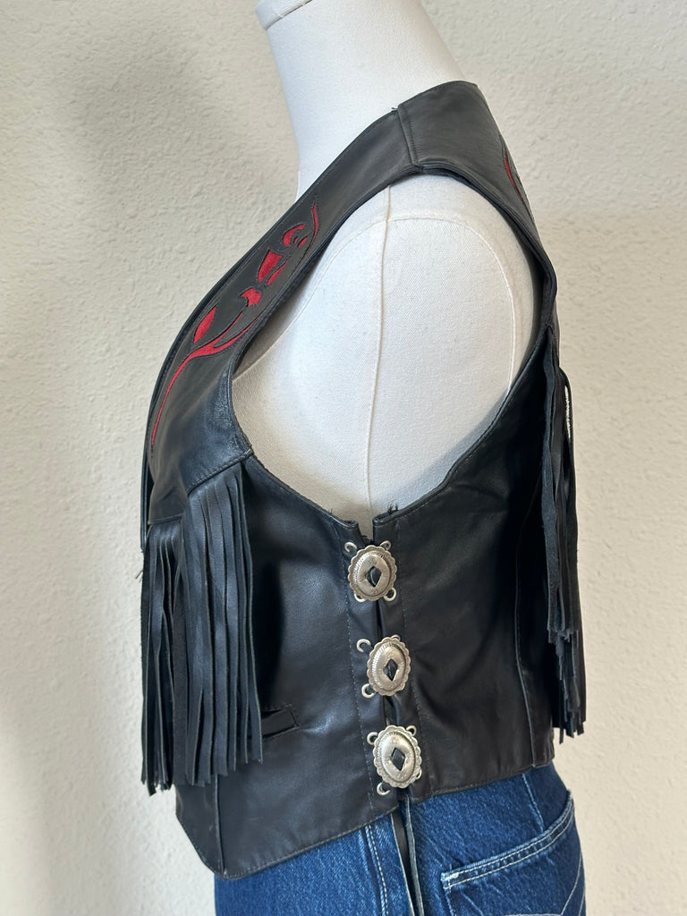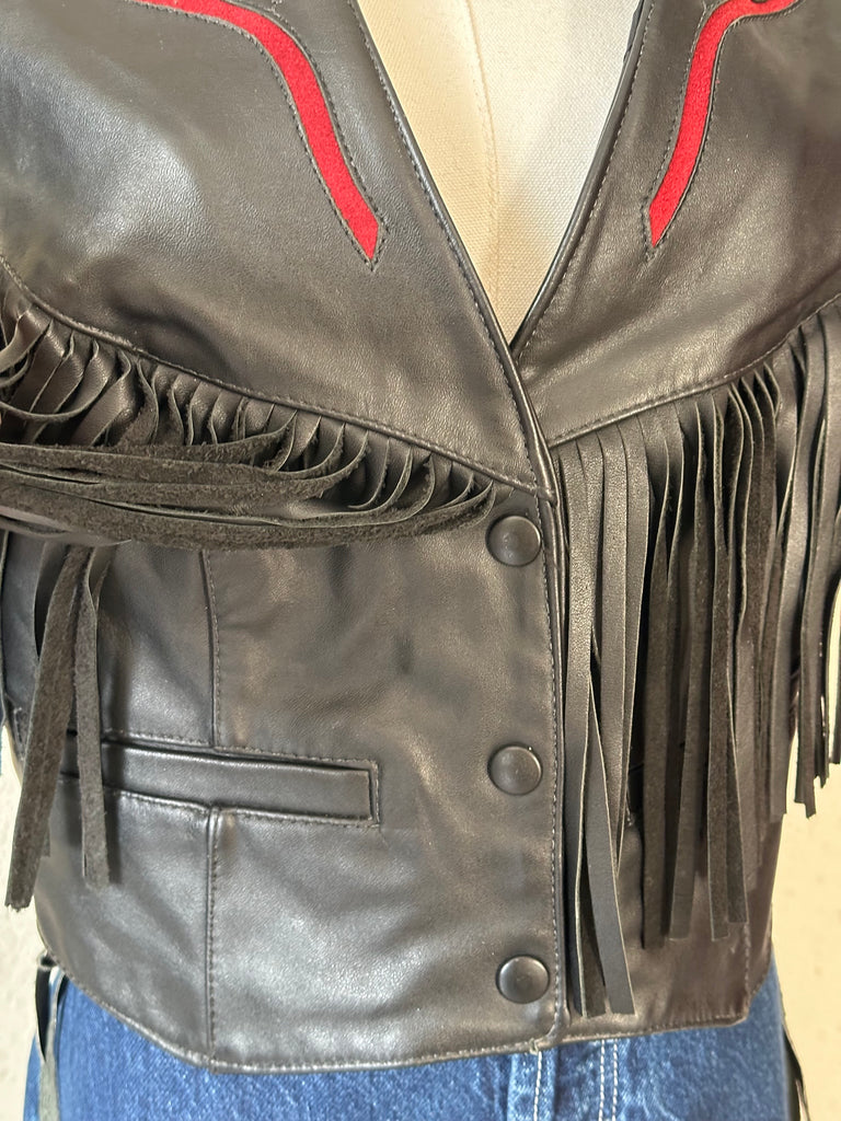 Vintage black moto-style vest with fringe detailing across the front and back. Features red suede appliqué accents, silver-tone concho-style hardware, and lace-up side closures for an adjustable fit. Fully lined with a snap front closure. Made in the USA.