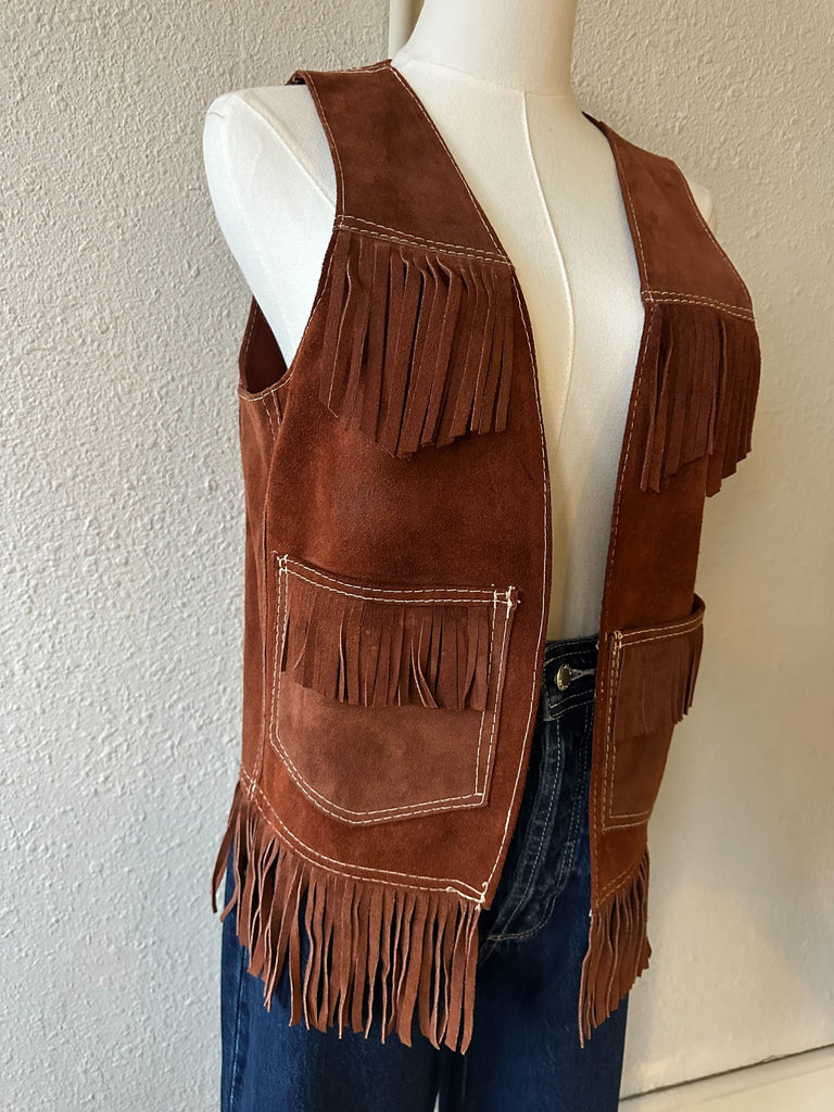 Vintage suede fringe vest featuring an open front design with fringe detailing throughout. Suede leather construction with contrast stitching, front patch pockets, and fringe along the chest, pockets, and hem. Structured fit with a soft suede finish.