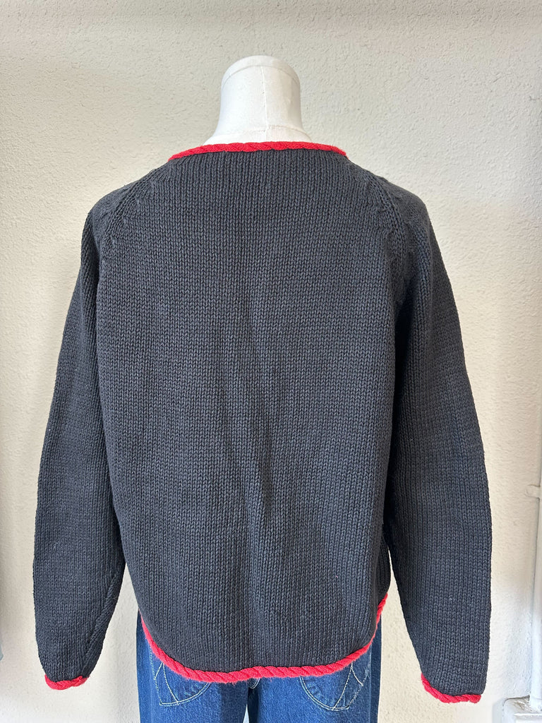 Vintage novelty knit cardigan featuring colorful crocheted sombrero motifs throughout. Crafted in a black knit base with bold red braided trim along the neckline, button placket, hem, and cuffs. Finished with hand-crocheted circular buttons and dangling pom-pom details for added texture and movement.
