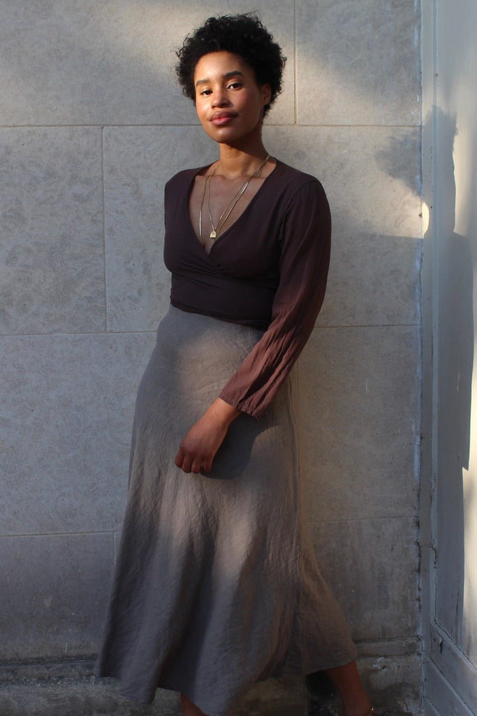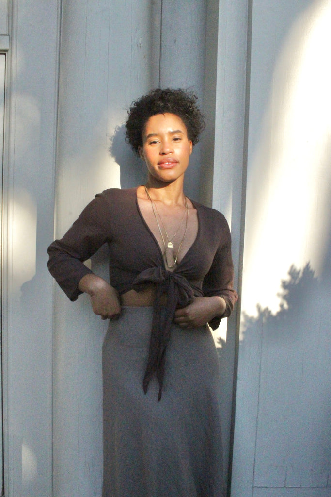 Our newest multi-way cotton tie front top in a beautiful deep chocolate brown. Chosen for its ultra thin, sheer, breathable material and the many styling possibilities, this piece can be tied in front or wrapped around the waste and secured in back. We love the Lillie top with high rise denim, or paired with our linen Mackenzie skirt.