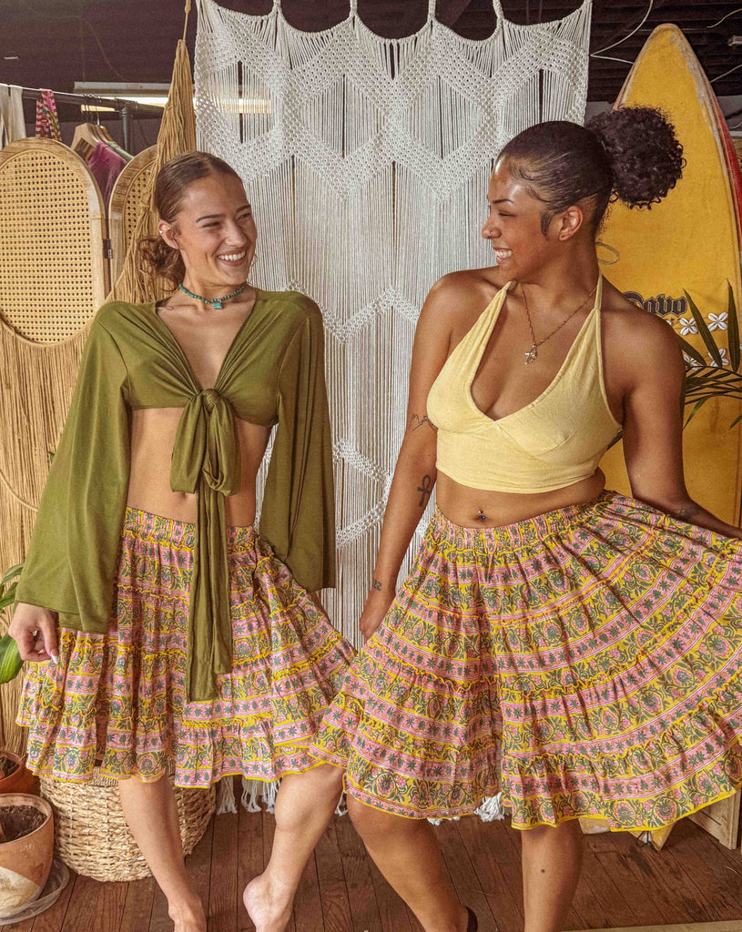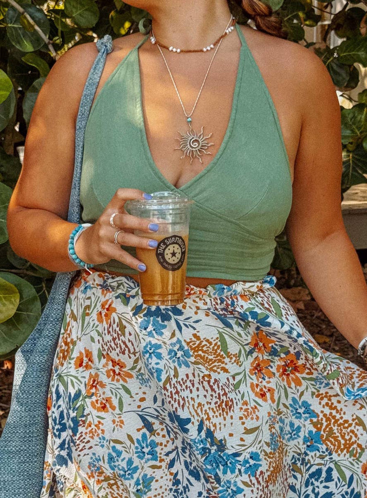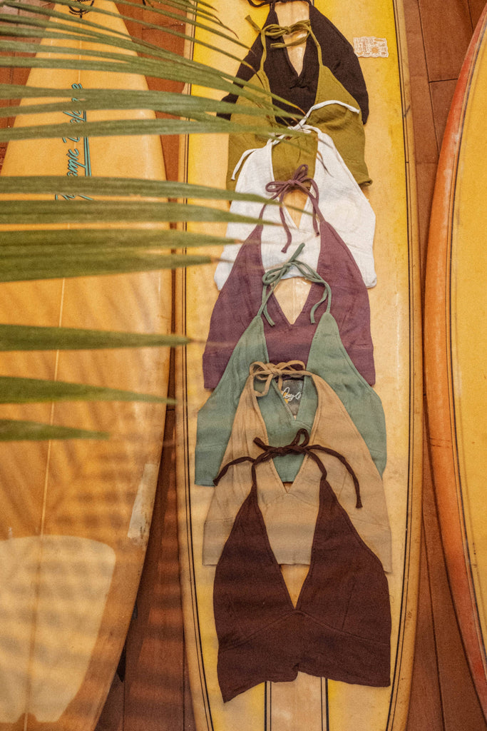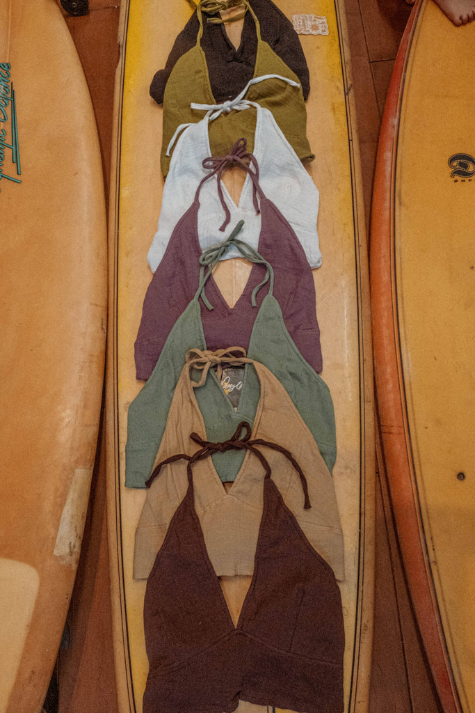 Cozy layering staple! In a soft buttery organic cotton bamboo fabric, this halter top is perfect for summery days to pair with your favorite vintage high rise denim, or as a layering piece. Tie to fit in the back for comfort and cuteness!
