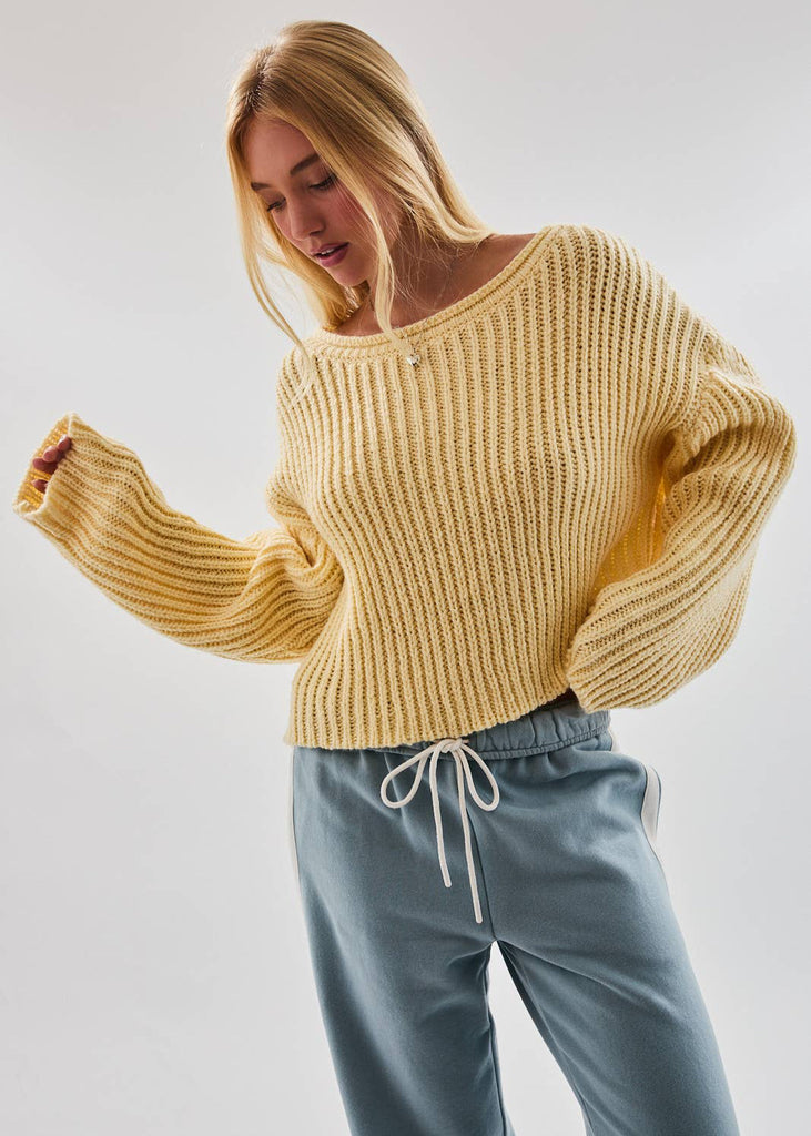 Classic ribbed sweater featuring a scoop neck, slightly cropped fit, loose sleeves, and a warm butter yellow.
