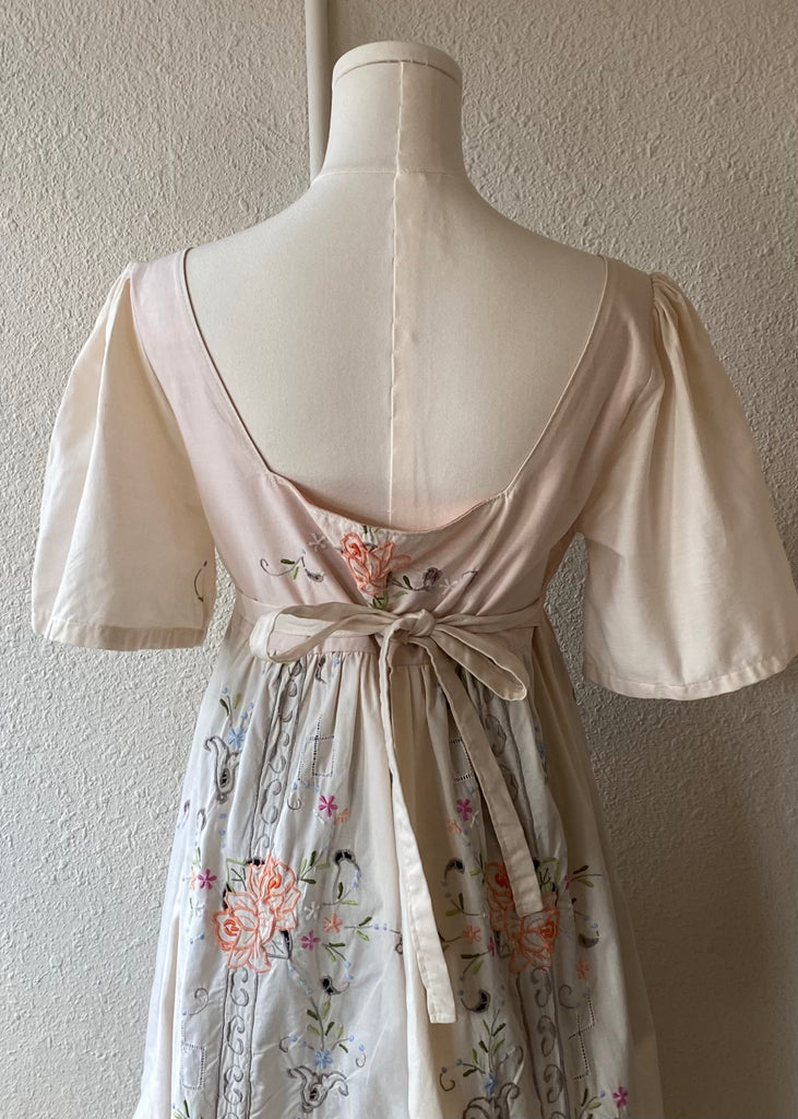 For Love of the Moon handmade one-of-a-kind maxi dress made from a beautiful vintage Italian hand-embroidered cotton blend paired with a lightweight pastel pink soft cotton. There is an elegant square neckline and square low back with a built in fabric belt for cinching the high waist to your fit. Neckline and back at bustline are lined for comfort with a soft cotton liner. Slightly puffed short sleeves. Each one is completely unique and handmade, variations to be expected. Handwash Only.