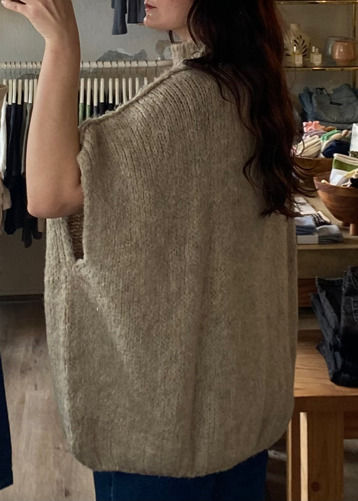 Oversized mock neck, sleeveless sweater with a reversed seam in a warm oatmeal color. The perfect fall layering piece.