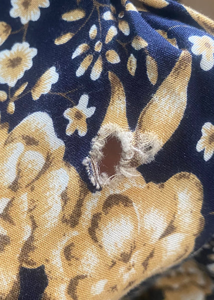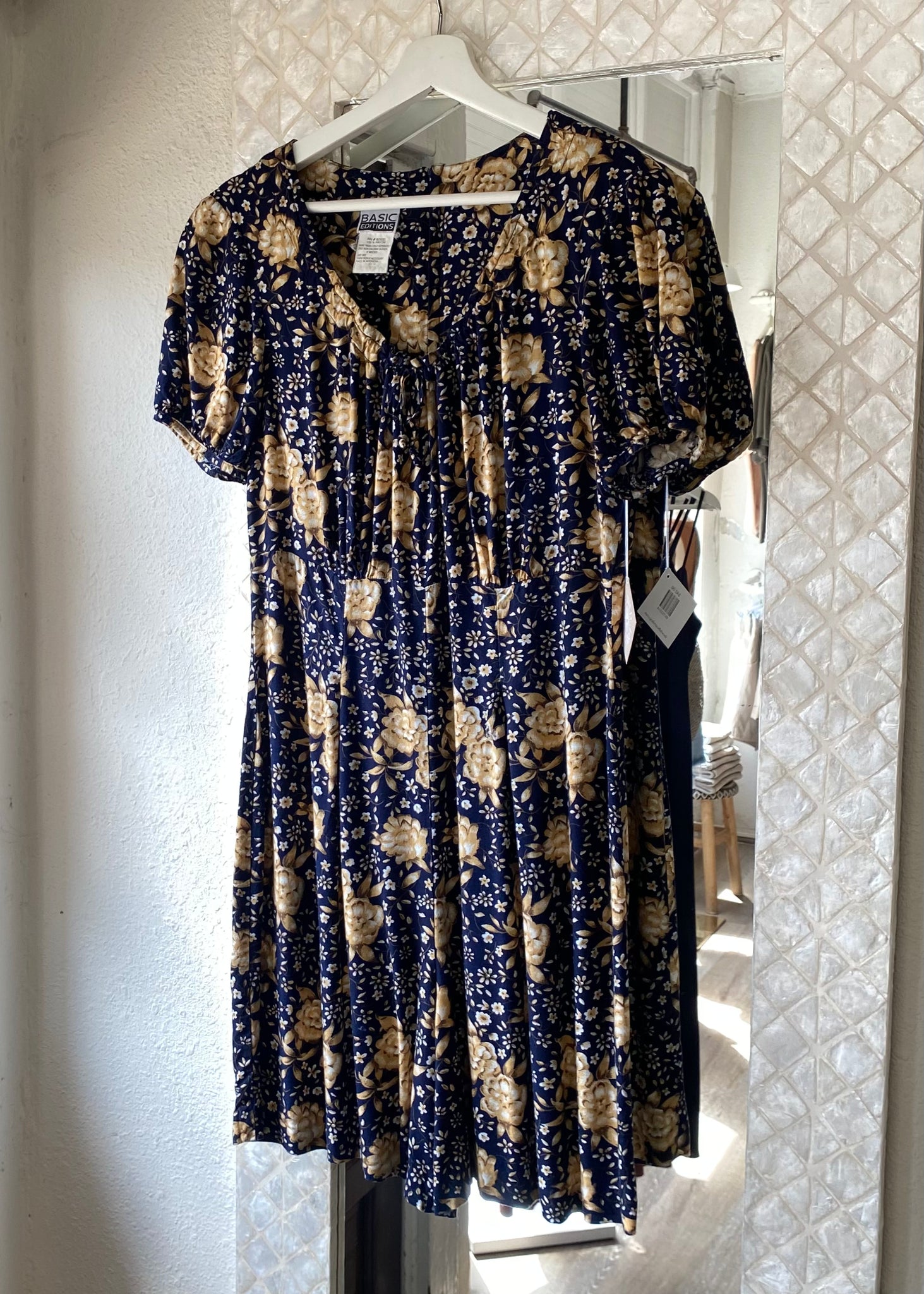 Romper with beige floral on navy, scoop neckline, and adjustable tie at neck.
